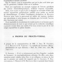 0221 - Page 207 - Séances des 14 mars et 11 avril 1962. Commémoration du centenaire de la naissance de Maurice Nicolle. Le rôle de Maurice Nicolle en chimiothérapie anti-trypanosomes, par le Professeur Jacques Tréfouel... / A propos du procès-verbal. A propos de la communication de MM. J. Deu, M. Fouchet, J. L. Rigaud et R. Vargues « La maladie de Charmot (Macroglobulinémie de type Africain) ». Bull. Soc. Path. Exot., 1961, 54, 1091-1111
