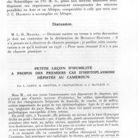 0247 - Page 229 - Séances des 14 mars et 11 avril 1962. Communications. Discussion en cours sur la lésion primaire du pian, par P. Botreau-Roussel. / Petite leçon d'humilité à propos des premiers cas d'histoplasmose dépistés au Cameroun, par A. Gamet, H. Brottes, P. Chataigneau et J. Blouzon