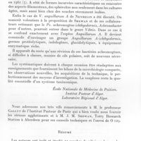 1189 - Page 1108 - Séances des 14 novembre et 12 décembre 1962. Mémoires. Confrontation entre les réactions immunologiques et les manifestations Cliniques, cystoscopiques, parasitologiques et hématologiques chez 31 malades atteints de bilharziose urinaire, par R. Deschiens, A. Toudoire et J. Bénex. Summary. (Hôpital militaire d'instruction du Val-de-Grâce. Service d'urologie : Docteur F. Rouffilange. Hôpital Tenon, pavillon Dolbeau. Service d'urologie : Docteur A. Dufour. Institut Pasteur. Service de parasitologie : Docteur R. Deschiens.). / Bibliographie. / Étude expérimentale chez le singe Macacus rhesus du rôle de l'Angiostrongylus cantonensis dans l'étiologie des méningites à éosinophiles observées chez l'homme dans certains territoires du Pacifique Sud, par G. Loison, A. Cavallo et G. Vervent