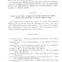0291 - Page 273 - Séances des 14 mars et 11 avril 1962. Mémoires. Recherches sur les vibrions marins. A propos de 44 souches isolées de moules (Mytilus gallo provincialis) du littoral algérois. Par Jean Brisou, Camille Tysset, M. Mailloux et S. Espinasse. Discussion. (École nationale de médecine de Poitiers. Institut Pasteur d'Alger. Laboratoire régional d'Alger.). / Résumé