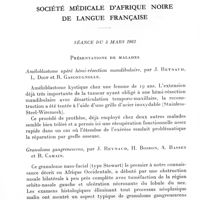 1012 - Page 945 - Société médicale d'Afrique noire de langue française. Séance du 2 juillet 1962. Résumés. Incidence de l'émétine atoxique sur le traitement de l'amibiase colique suraiguë, par P. Nosny, G. Clément et J. Courbil. / Les injections intra-articulaires de corticoïdes dans le traitement des arthroses temporo-maxillaires, par G. Grappin et J. Barnaud. / Volumineux améloblastome traité par radiothérapie, suivie de greffe osseuse par prélèvement iliaque, par G. Grappin et J. Barnaud. / A propos de 30 cas de lésions des os longs chez les lépreux, par A. Carayon, J. Languillon, P. Bourrel et A. Basset