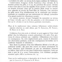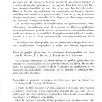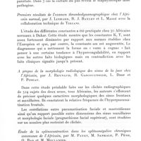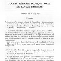 1301 - Page 1214 - Sociétés correspondantes. Société médicale d'Afrique noire de langue française. Séance du 5 novembre 1962. A propos d'une lésion oculaire grave en rapport avec un kyste corono-dentaire chez un enfant de 12 ans, par G. Grappin, L. Guérin et J. Thaler. / Traitement par les chélateurs de certains types de lithiase sous-maxillaire, par G. Grappin et J. Barnaud. / Sur une malformation dento-faciale courante chez l'enfant africain à Dakar : la béance incisive, par G. Grappin et J. Barnaud. / Introduction à l'étude de la parodontolyse chez l'Africain de Dakar, par G. Grappin, J. Peluchon et J. Barnaud. / Technique de cranioplastie en un temps à l'aide des résines acryliques autopolymérisables, par B. Courson et G. Grappin. / Chéloïdes géantes cervicales. Deux cas traités par association radiochirurgicale, par B. Courson, A. Cayret, A. Basset. Histologie : R. Camain. / Pneumatocèle ventriculaire et diabète insipide post-traumatique, par B. Courson, H. Collomb et H. Ayats. / Choix d'un anesthésique de base pour opération césarienne (A propos de 900 observations), par S. N'D. Gueye