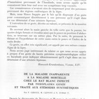 0033 - Page 31 - Séances des 10 janvier et 14 février 1962. Communications. Une observation peu commune d'un cas de rage des rues dans un élevage de lapins domestiques au Cameroun, par A. Landon et H. Brottes. (Institut Pasteur du Cameroun.). / Histoplasmose expérimentale du singe, par R. Baylet, C. Quénum, M. Ba et P. Hocquet