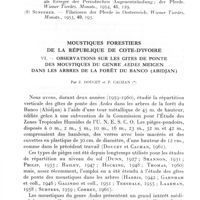 0985 - Page 918 - Séances des 4 juillet et 10 octobre 1962. Mémoires. Description de la nymphe d'Uranotaenia cavernicola mattingly, 1954. Notes morphologiques et écologiques sur la larve et l'adulte, par G. Vattier et J. P. Adam. / Moustiques forestiers de la République de Côte-d'Ivoire. VII. - Observations sur les gîtes de ponte des moustiques des genres Uranotaenia lynch-arribalzaga, Culiseta felt et Culex linnaeus dans les arbres de la forêt du Banco (Abidjan), par J. Doucet et P. Cachan