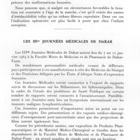 0187 - Page 177 - Sociétés correspondantes. Société médicale d'Afrique noire de langue française. Séance du 8 janvier 1962. Le microclimat de la presqu'île du Cap-Vert : son déterminisme physiologique, par M. Payet, P. Pène, M. Sankalé et H. de Loture. / Relation entre les facteurs saisonniers et l'absentéisme médical chez les travailleurs des industries manufacturières de la région de Dakar (décembre 1958 à décembre 1959), par P. Pène, A. Hauser et H. de Loture. / Séance du 5 février 1962. Présentations de malades. Histoplasmose à forme cutanéo-osseuse, par A. Basset, P. Hocquet, M. Larivière, Ba (Kaolack), R. Camain et Mme M. Basset. / Histoplasmose à forme sous-cutanée, par A. Basset, X. Sérafino, M. Larivière, P. Hocquet, R. Camain, Mme M. Basset et E. Goudote
