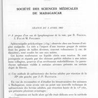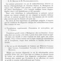 0996 - Page 929 - Sociétés correspondantes. Société des sciences médicales de Madagascar. Séance du 8 mai 1962. 1) Mélanoblastomes observés à Madagascar. Le point de vue du laboratoire d'histo-pathologie à propos de 105 observations, par E. R. Brygoo et R. Randriambololona. / 2) Toxoplasmose expérimentale. Présentation de micro-photos, par P. Sureau. / 3) Sur un cas de réticulopathie de l'enfance, par médecins-commandant Cousin, commandant Faugère et médecin-lieutenant Monjour. / 4) Traitement oral par sultirène de 4 cas de lèpre (3 formes L et 1 forme I), par Mathurin, P. Delpy et L. D. G. Razafindrakoto