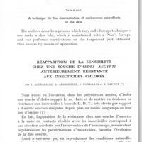 1045 - Page 970 - Séances des 14 novembre et 12 décembre 1962. Communications. Technique de recherche des microfilaires d'onchocerques dans la peau, par A. Basset, M. Larivière et P. Hocquet. / Réapparition de la sensibilité chez une souche d'Aedes aegypti antérieurement résistante aux insecticides chlorés, par J. Aldighieri, R. Aldighieri, J. Fondarai et J. Sautet