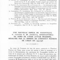 1055 - Page 980 - Séances des 14 novembre et 12 décembre 1962. Communications. Une nouvelle espèce de Nosopsyllus, N. Vauceli n. sp. (Insecta, Siphonaptera) du Nord de l'Inde (Uttar pradesh), récoltée par la mission de l'Institut Pasteur de l'Iran en 1954-1956, par J. M. Klein. / Titrage du complément chez l'Africain normal, par J. Linhard (avec la collaboration technique de Mme Malvoisin)
