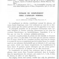 1059 - Page 984 - Séances des 14 novembre et 12 décembre 1962. Communications. Titrage du complément chez l'Africain normal, par J. Linhard (avec la collaboration technique de Mme Malvoisin). (Laboratoire d'hématologie de la Faculté de médecine de Dakar. Professeur agrégé : J. Linhard.). / Mémoires. La transformation tuberculoïde des lèpres lépromateuses, par Étienne Montestruc