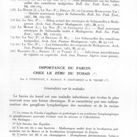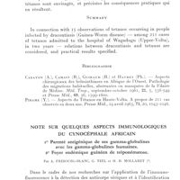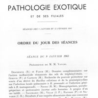 0299 - Page 276 - Sociétés correspondantes. Société médicale d'Afrique Noire de langue française. Séance du 4 février 1963. Hallucinations complexes olfacto-gustatives de tonalité agréable, provoquées par un méningiome frontal, par B. Courson, J. Bert et L. Avramov. / Un foyer de brucellose humaine au Sénégal (région de Diourbel). A propos de deux observations de malades hospitalisés et d'une enquête épidémiologique effectuée à leur village, par M. Armengaud, M. Guérin, J. J. Bourgoin, I. Diop Mar, L. Chambon et J. Cadillon (de l'Institut Pasteur), Chambron (au Service d'Élevage). / Séance du 4 mars 1963. Une condition inattendue d'explosion anesthésique, par S. N'D. Gueye. / Réflexions sur deux cas de tétanos pithiatiques, par H. Collomb, H. Ayats et J. Zwingelstein. / Solutions anciennes de Nesdonal à Dakar (expérimentation et clinique, intérêt pratique), par O. Sylla et S. N'D. Gueye. / Dislocation atloïdo-axoïdienne et maladie de Bouillaud, par B. Courson, L. M. Hubert, Y. Philippe et A. Cayret. / Utilisation du succinate sodique de réhydroxypregnandion (I) dans deux cas de rage humaine, par M. Ducloux présenté par le Docteur Hocquet (Dakar). / Protéinémie de l'Africain et mode de vie, par E. N. Moyen, M. Mallet et H. Boiron. / Protéinémie de l'Africain : influence de la gestation, par E. N. Moyen, M. Mallet et H. Boiron