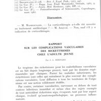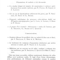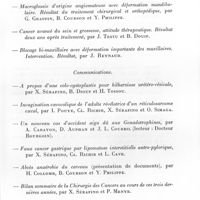0300 - Page 277 - Sociétés correspondantes. Société médicale d'Afrique Noire de langue française. Séance du 18 mars 1963. Présentation de malades. Macroglossie d'origine angiomateuse avec déformation mandibulaire. Résultat du traitement chirurgical et orthopédique, par G. Grappin, B. Courson et Y. Philippe. / Cancer avancé du sein et grossesse, attitude thérapeutique. Résultat deux ans après traitement, par J. Testu et B. Douif. / Blocage bi-maxillaire avec déformation importante des maxillaires. Intervention. Résultat, par J. Reynaud. / Communications. A propos d'une colo-cystoplastie pour bilharziose urétéro-vésicale, par X. Sérafino, B. Diouf et H. Tossou. / Invagination caecocolique de l'adulte révélatrice d'un réticulosarcome caecal, par I. Pouye, Cl. Richir, X. Sérafino et O. Simaga. / Un nouveau cas d'accident aigu dû aux Gonadotrophines, par A. Carayon, D. Auphan et J. L. Courbil (lecteur : Docteur Bourgoin). / Faux cancer gastrique par lipomatose interstitielle antro-pylorique, par X. Sérafino, Cl. Richir et L. Cave. / Abcès anaérobie du cerveau (présentation de documents), par H. Collomb, B. Courson et Y. Philippe). / Bilan sommaire de la chirurgie des cancers au cours de ces trois dernières années, par X. Sérafino et P. Menye