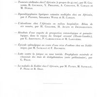 0301 - Page 278 - Sociétés correspondantes. Société médicale d'Afrique Noire de langue française. Séance du 1er avril 1963. Communications. Tumeurs cérébrales chez l'africain (à propos de 43 cas), par H. Collomb, B. Courson, Y. Philippe, A. Carayon, R. Camain et M. Dumas. / Dysembryoplasies kystiques cutanées multiples chez un africain, par J. Plessis, Ibrahima Wone et R. Camain. / L'alcoolisme chez l'africain en milieu hospitalier. Bilan de six années, par H. Collomb, H. Ayats et Zwingelstein. / Résultats d'une enquête de prospection entomologique et parasitologique, dans la région du Sénégal Oriental (Haute-Gambie), par E. Abonnenc, P. Camerlynck et M. Larivière. / Épisode splénalgique au cours d'une crise d'asthme chez un Sicklémique, par M. Sankalé et F. Roumetz. / Lutte contre la fatigue en zone torride. Prophylaxie minérale et vitaminée des états de déshydratation (note préliminaire), par G. Pille. / La maladie de Kahler chez l'africain, par M. Payet, M. Sankalé, P. Pène et B. Diop