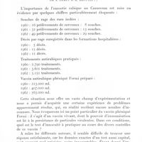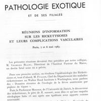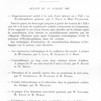 0298 - Page 275 - Sociétés correspondantes. Société médicale d'Afrique Noire de langue française. Séance du 28 janvier 1963. Séance chirurgicale. Communications. Anurie post-opératoire réflexe, guérison, par G. Sérafino. / Staphylococcémie aiguë chez un diabétique âgé ayant présenté une urée sanguine élevée, par G. Sérafino et A. Diop. / A propos d'un cas de lymphangiome kystique cervical, localisation exceptionnellement haute et déformation mandibulaire, par P. Nosny, G. Clément, B. Courson, G. Grappin et A. Crayret. / Un cas de perforation de l'iléon chez un schizophène, par ingestion massive d'objets métalliques, par M. M. E. Benoist et J. Zwingelstein (Travail effectué à la Clinique de Neuro-Psychiatrie du Centre Hospitalier de Fann sous la direction de M. le Professeur Henri Collomb). / Séance du 4 février 1963. Intérêt de l'épreuve thérapeutique de Gutmann, illustré par une observation de faux cancer gastrique, par L. Cave, M. Louvain et J. Feral. / Les incidents et accidents du traitement de la trypanosomiase par le Mel W (à propos de 38 cas), par H. Collomb, J. Wzingelstein, H. Ayats et I. Seek (résumé non parvenu). / Considérations radiologiques et pathogéniques sur les lésions artérielles dans la lèpre. A propos de 8 artériographies, par J. Basset, L. Cave, P. Menye et I. Faye. / Considérations générales sur le tétanos à Dakar. A propos de 444 observations, par M. Armengaud, I. Diop Mar, A. Sanakho et M. Louvain. / La ponction-biopsie du foie. Étude analytique à propos de 3.000 examens, par M. Payet, P. Pené, R. Camain, M. Sankale, M. Moulanier, J. P. Ancelle et M. Louvain (résumé non parvenu)