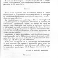 0896 - Page 843 - N° 4. Séances de travail des réunions d'information. Section IV. Prophylaxie spécifique des rickettsioses. Rappel de l'action de la chimiothérapie dans les rickettsioses, par G. Renoux. Remarques générales sur l'emploi des antibiotiques en clinique des rickettsioses. / Résumé. (Faculté de médecine, Montpellier.). / Références