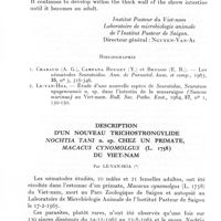 0136 - Page 128 - Séances des 12 janvier et 9 février 1966. Communications. Cycle évolutif de Seuratum nguyenvanaii, Le-Van-Hoa, 1964, parasite de la musaraigne, Suncus murinus (L.) au Viet-Nam. (Note Préliminaire), par Le-Van-Hoa. (Institut Pasteur du Viet-Nam laboratoire de microbiologie animale de l'Institut Pasteur de Saigon. Directeur général : Nguyen-Van-Ai.). / Description d'un nouveau trichostrongylide Nochtia tani n. sp. chez un primate, Macacus cynomolgus (L. 1758) du Viet-Nam, par Le-Van-Hoa