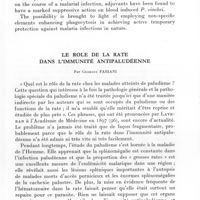 0673 - Page 639 - N° 4. Séances de travail des réunions d'information. Section III. Immunité dans le paludisme. Le rôle de la rate dans l'immunité antipaludéenne, par Georges Fabiani. III. - Rate et immunité antipaludéenne chez l'homme. / Résumé. (Faculté de médecine et pharmacie, Grenoble.). / Bibliographie