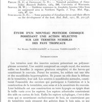 0933 - Page 889 - Séance des 6 juillet et 12 octobre 1966. Communications. Contribution à l'étude du parasitisme des adultes d'Anopheles funestus par Gastromermis sp. (Mermithidae), par J. Coz. / Étude d'un nouveau pesticide chimique possédant une action sélective sur les termites nuisibles des pays tropicaux, par Michel Tahiri-Zagrët et Claudine Tahiri-Zagrët