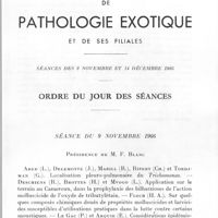 0164 - Page 156 - Sociétés correspondantes. Société médicale d'Afrique Noire de langue française. Séance du lundi 3 janvier 1966. Allocation du président sortant. / Allocation du nouveau président. / Communications. Multiplicité de groupes et qualité du sang conservé (A propos d'une observation), par S. N'D Gueye, R. Fustec, J. Linhard, D. Obonou, C. R. Conty et P. Grellier. / A propos d'une intoxication au phosphore, par S. N'D Gueye, E. Goudote et D. Obonou. / Encéphalites post-vaccinales : étude virologique, par R. Baylet et R. Camain. / Treize cas de falciformation avec lésions osseuses. Pouvoir destructif des divers germes, par A. Carayon, P. Perquis, H. Plassart, J. L. Courbil et Oudart. / Maladie de Waldenström à forme osseuse condensante, par P. Pène, L. Cave, P. Mattern et J. C. Bernou. / Sténose non tumorale de l'aqueduc de Sylvius, par H. Collomb, B. Courson, G. Lemercier et C. Giordano