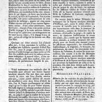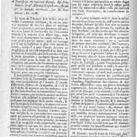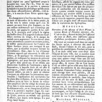 0143 - Page 143 - N°36 / Médecine Pratique Observation sur la guérison d'une hydropisie générale ou anazarque, opérée par l'effet diurétique qui est résulté d'un vésicatoire aux jambes; par M. Godinet / Médecine Narrative of the efficacy of Bath Waters in various Kinds of Paralitic disorders, &c. C'est-à-dire; Recueil de faits sur l'efficacité des eaux de Bath, dans differentes espèces d'affections paralytiques. Londres 1787 / Matière Médicale Remarques sur les divers médicamens qu'il faut associer suivant les circonstances à l'usage du quinquina. (Medical cautions by J.M. Adair, London)
