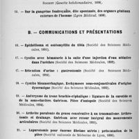 0020 - Page 20 - II. Travaux scientifiques. B. Communications et présentations. 11. Sur l'épithélioma dendritique du sein. - Pathogénie des formations kystiques de la mamelle / 13. De l'adénôme vésical