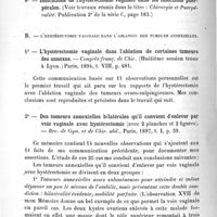 0138 - Page 140 - Troisième partie. Résumé analytique des principaux travaux énumérés dans la deuxième partie. Troisième groupe. Gynécologie et chirurgie abdominale. IV. Hystérectomie vaginale. A. L'hystérectomie vaginale dans le traitement des suppurations pelviennes et des lésions annexielles non néoplasiques / B. L'hystérectomie vaginale dans l'ablation des tumeurs annexielles