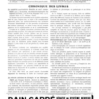 0124 - Page 82 - Chronique des livres. Les ramollissements sylviens. Étude de l'anatomie de l'artère sylvienne et des syndromes anatomo-cliniques des lésions en foyer de son territoire, par le Dr Maurice-Lévy... (Librairie Octave Doin. Gaston Doin et Compagnie, éditeurs, Paris) / Principes scientifiques de récupération fonctionnelle des paralytiques, par le Dr Gabriel Bidou. Préface du Professeur Georges Guillain / Syndromes neuro-hypophysaires, par le Professeur G. di Guglielmo... (Instituto éditoriale scientifico, via Montenapoleon, 35, Milan) [M. Cayrel]