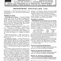 0834 - Page sans numérotation - Dernières nouvelles. Hôpitaux de Paris / Ecole de médecine de Nantes / Hôpitaux de Bordeaux / Hôpital de Saint-Germain-en-Laye / Association des membres du corps enseignant des Facultés de médecine de l'Etat