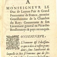 0007 - Page sans numérotation - A Monseigneur le Duc de Luynes Pair & Grand d Fauconnier de France, premier Gentilhomme de la Chambre du Roy, Gouuerneur & son Lieutenant general en Picardie, Boullonnoys & pays reconquis