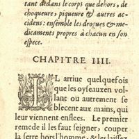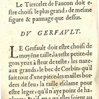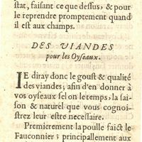 0017 - Page 1 - Comme il faut recognoistre & choisir les oyseaux, tant d'autrucherie que fauconnerie, chacun en leur espece, de leur figure, taille & pannage, & pour cognoistre s'ils sont legers, courageux, de longue halaine, & roides à la toize. Chapitre I. De l'espervier
