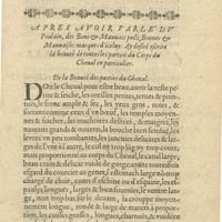 0013 - Page 5 - Apres auoir parlé du poulain, des bons & mauuais poils, bonnes & mauuaises marques d'iceluy: ay desiré escrire la beauté de toutes les parties du corps du cheual en partiuclier