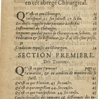 0260 - Page sans numérotation - Table des principales matieres traitees en cet abregé chirurgical / Section premiere / Des tumeurs