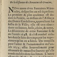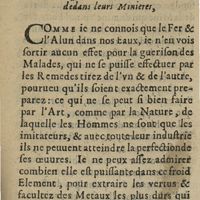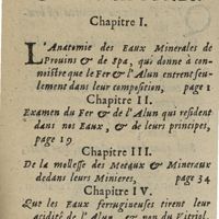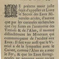 0025 - Page 1 - Le secret des eaux minerales. Chapitre premier. L'anatomie des eaux minerales de Prouins & de Spa, qui donne à connositre que le Fer & l'Alun entrent seulement dans leu composition