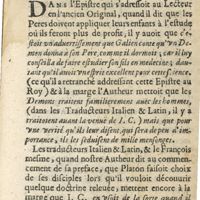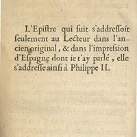 0034 - Page sans numérotation - L'Epistre qui suit s'addressoit seulement au lecteur dans l'ancien original, & dans l'impression d'Espagne dont ie t'ay parlé, elle s'addresse ainsi à Philippe II