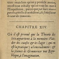 0462 - Page 382 - Chapitre XIV / Où il est prouvé que la theorie des loix appartient à la mémoire - plaider des causes & les iuger ( qui en est la pratique) à l'entendement & la science de gouverner une Republique, à l'imagination