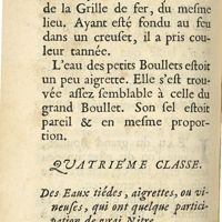 0104 - Page 100 - Quatrième classe. Des eaux tièdes, aigrettes, ou vineuses, qui ont quelque participation de vrai nitre