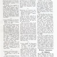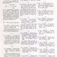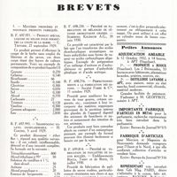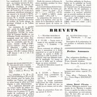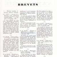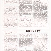 0059 - Page 47 - Brevets. B. F. 650.147. - Procédé d'extraction des huiles ou des jus et dispositif en permettant la mise en oeuvre. - P. Zahra, 16 août 1927 / B. Am. 1.697.618. - Extracteur de jus. - C. Perkins et A. Noretgren, 18 juin 1926 / B. Am. 1.698.860. - Extracteur de jus de fruits. - C.-J. Ulrich, 23 août 1926 / B. Am. 1.699.995. - Appareil pour peler les fruits. - H.-M. Shields, 7 juillet 1925 / B. An. 302.297. - Procédé pour la récupération des solvants volatils. - J.-Y. Johnson, 12 septembre 1927 / B. F. 649.701. - Procédé de fabrication d'un article de parfumerie tel que fard et produits conformes à ceux obtenus par ce procédé. - P. Baudecroux, 13 juillet 1927 / B. F. 649.731. - Procédé de préparation de savons stables aux sels de dureté de l'eau et produits industriels nouveaux en résultant. - Société anonyme pour l'Industrie chimique, 19 juillet 1927 / Petites annonces