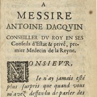 0009 - Page sans numérotation - A Messire Antoine Dacquin Conseiller du Roy en ses Conseils d'Estat & privé, premiere Medecin de la Reyne