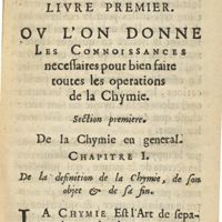 0019 - Page 1 - Livre premier. Ou l'on donne les connoissances necessaires pour bien faire toutes les operations de la Chymie. Section premiere. De la Chymie en general. Chapitre I. De la definition de la Chymie, de son objet & de sa fin