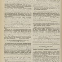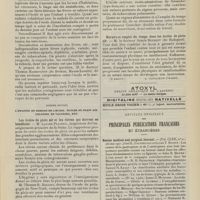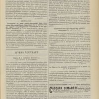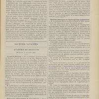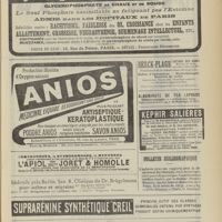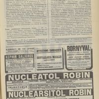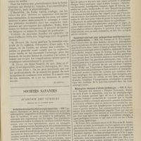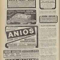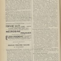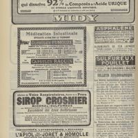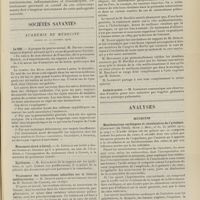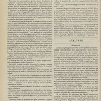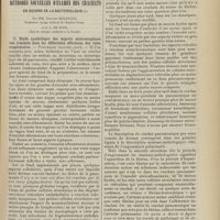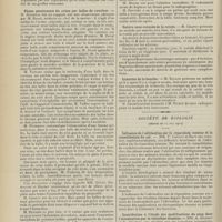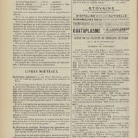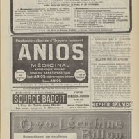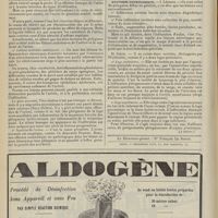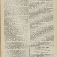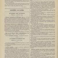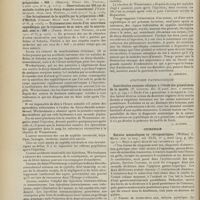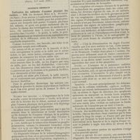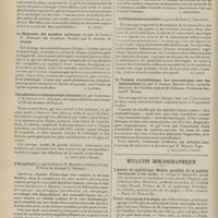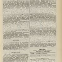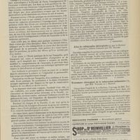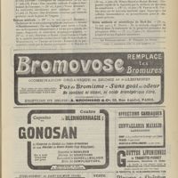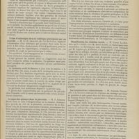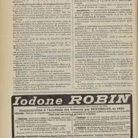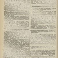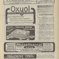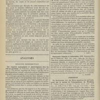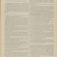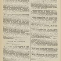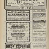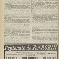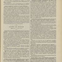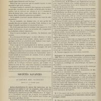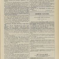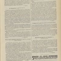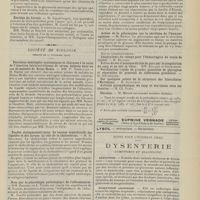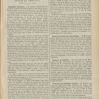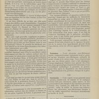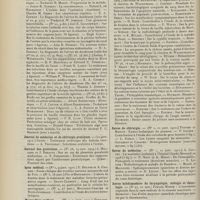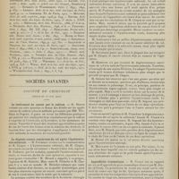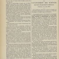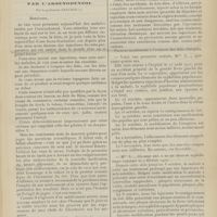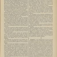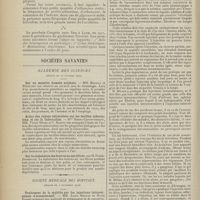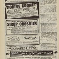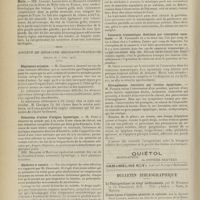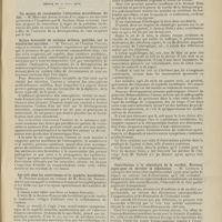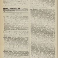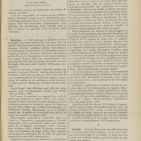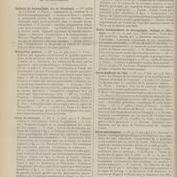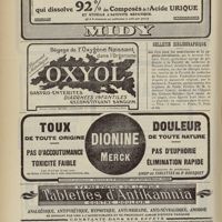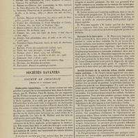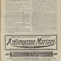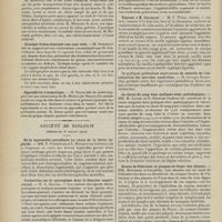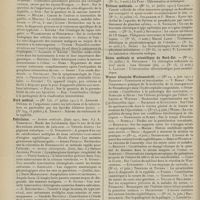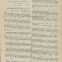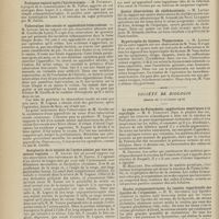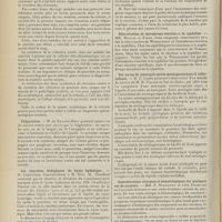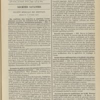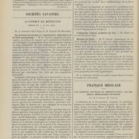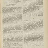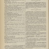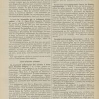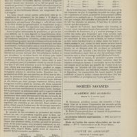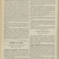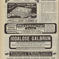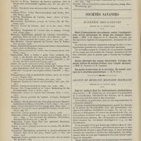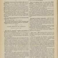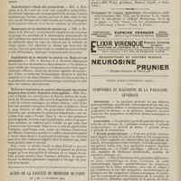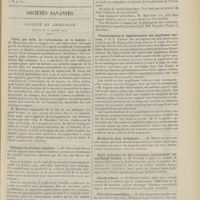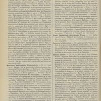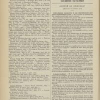 1912 - Page 1902 - Sociétés savantes. Société de biologie. (Séance du 3 décembre 1910). Putréfaction des humeurs de l'organisme. MM. Javal et Boyet / Toxicité comparée sur le système nerveux des sels de mercure de l'hectine et du 606. M. Jean Camus / Nature de la dégénérescence caséeuse dans la tuberculose aviaire. M. Chaussé / Toxicité du suc d'autolyse du foie de porc. M. Billard / La réaction indol-nitreuse dans les cultures de matières fécales en l'absence de vibrions cholériques. M. Reybaud / Etudes stalagmométriques. La tension superficielle de quelques colloïdes lyophiles. M. H. Iscovelsco / Existence et survivance du microorganisme à la surface du saucisson et du cervelas. M. Maurel / Société de médecine de Paris. (Séance du 26 novembre 1910). Traitement des fractures du coude chez l'enfant. M. Barbarin