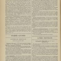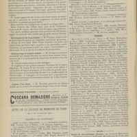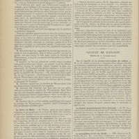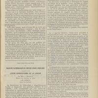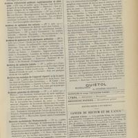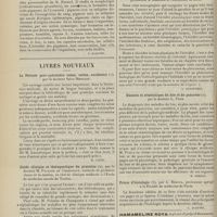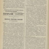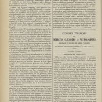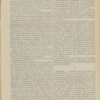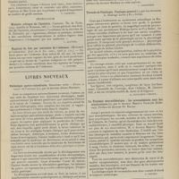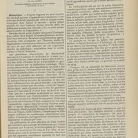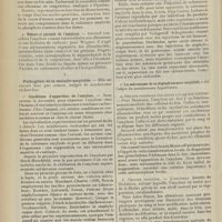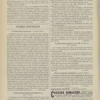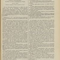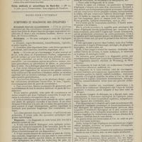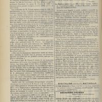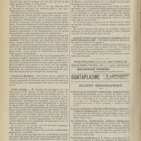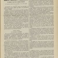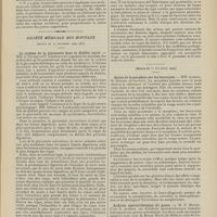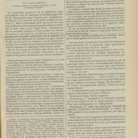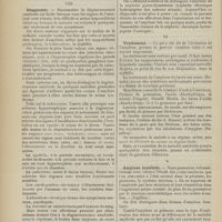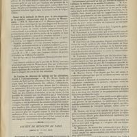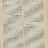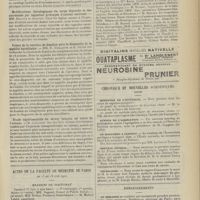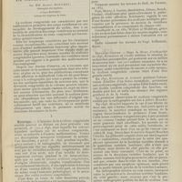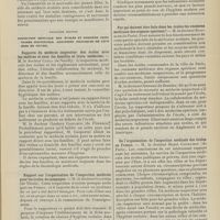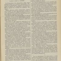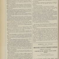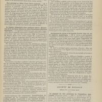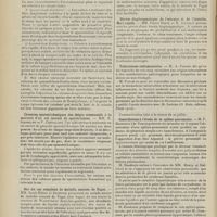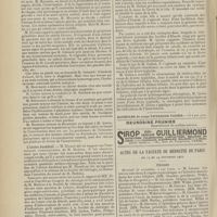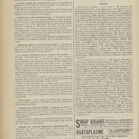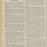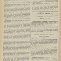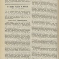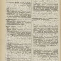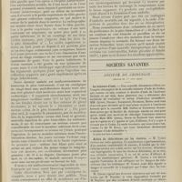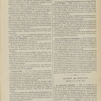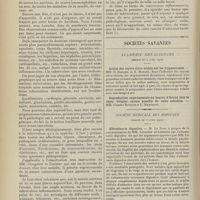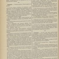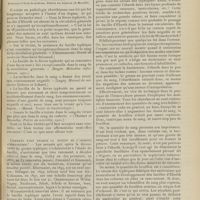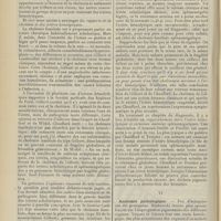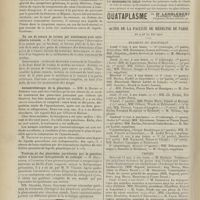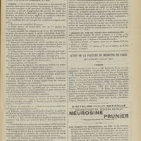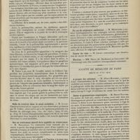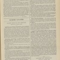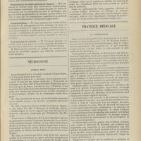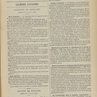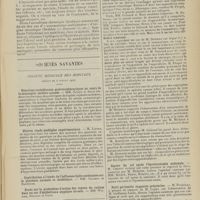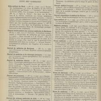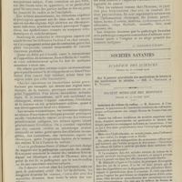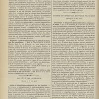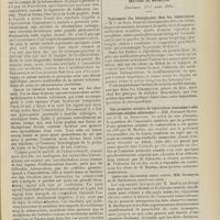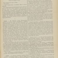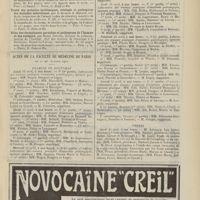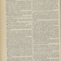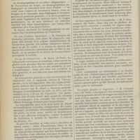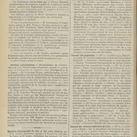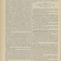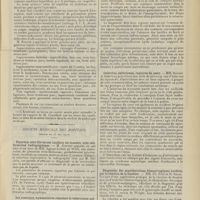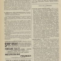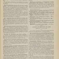 0099 - Page 89 - Sociétés savantes. Société médicale des Hôpitaux. (Séance du 14 janvier 1910). Aplasie congénitale localisée de la paroi thoracique. MM. Apert et Buc / Société de biologie. (Séance du 15 janvier 1910). Recherches sur le rôle des plaquettes dans la rénovation sanguine / Altérations des canalicules biliaires intra-cellulaires. MM. N. Fiessinger et L. Lyon-Caen / L'indosé urinaire anormal, symptôme précoce du diabète, sa valeur dans les états diabétiques frustes. MM. L. Lortat-Jacob et H. Labbé / Variations du pouvoir chimiotaxique en rapport avec la virulence du bacille tuberculeux. MM. F. Arloing... et H. Grimbert... / Arrêt et séjour prolongé du sulfate de radium dans les tissus vivants, pendant une durée excédant une année. MM. Dominici et Faure-Beaulieu / Dysenterie bacillaire expérimentale par ingestion. MM. Dopter et Repaci / Bacille bulgare contre l'anhémobacille entérocogène du rhumatisme (bacille d'Achalme, variété rhumatismale). M. G. Rosenthal / Les bases scientifiques de la bactériothérapie par les ferments lactiques. Bacille bulgare contre bacille pyocyanique. MM. G. Rosenthal et Chazarain-Wetzel