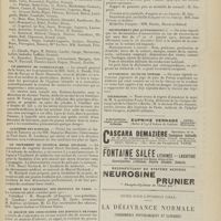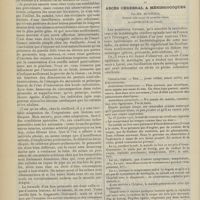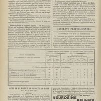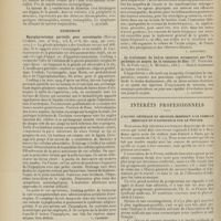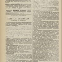 2010 - Page 2000 - Sociétés savantes. Société médicale des Hôpitaux. (Séance du 16 décembre 1910). Guérison de chancres syphilitiques par le 606. Nouveau chancre syphilitique trois mois après. M. Milian / Fièvre typhoïde ; début brusque par un syndrome méningitique. MM. F. Trémolière et Touraine / Société de neurologie. (Séance supplémentaire d'anatomie pathologique du 8 décembre 1910). Etude anatomique sur coupes sériées d'un cas d'hémianesthésie par lésion corticale. MM. Roussy et Foix / Myasthénie d'Erb-Goldflam. MM. Roussy et Rossi / Epithélioma cylindrique de l'hémisphère cérébelleux droit consécutif à un cancer du rectum. MM. Laignel-Lavastine et Boudon / Hyperplasie hypophisaire dans la sclérose en plaques. M. Lhermitte / Coloration myélinique rapide. Mlle Loyes / Hydrocéphalie aiguë par épendymite. M. Delamare / Lésions de la de la poliomyélite aiguë. M. Tinel / Un cas de poliomyélite subaiguë de l'adulte. MM. Prévost et Martin / Sur les tumeurs de l'angle ponto-cérébelleux. M. Jumentie / Maladie de Recklinghausen. M. Goducheau / Société de médecine de Paris. (Séance du 9 décembre 1910). A propos du traitement antisyphilitique du tabes (présentation de malade). M. Alquier