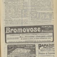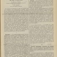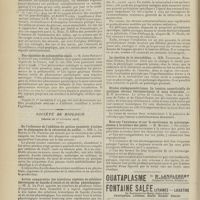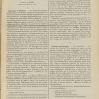 0100 - Page 90 - Sociétés savantes. Société de biologie. (Séance du 15 janvier 1910).Les bases scientifiques de la bactériothérapie par les ferments lactiques. Bacille bulgare contre bacille pyocyanique. MM. G. Rosenthal et Chazarain-Wetzel / Biligénie hémolytique locale dans les mucocèles des sinus frontaux. Analyse chimique et cytologique d'un nouveau cas. M. Mestrezat / La fièvre de Malte dans l'Hérault. MM. Lagriffoul, Arnal et H. Roger / Méthode de transfusion du sang par anastomose, entre l'artère et la veine, de segments de vaisseaux hétérogènes. M. C. Fleig / Avis / Pratique médicale. Diagnostic et traitement de la gangrène pulmonaire ; par M. Fageol