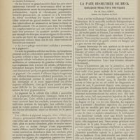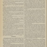 2055 - Page 2045 - Sociétés savantes. Société médicale des Hôpitaux. (Séance du 23 décembre 1910). Sporotrichum Jeanslemei. MM. De Beurmann et Gougerot / Etat méningé au début d'une fièvre typhoïde. M. P. Lereboullet, sur la communication de MM. Trémolières et Touraine / La lipémie alimentaire dans quelques ictères. Dissociation de la sécrétion biliaire au cours de certaines affections hépatiques / Arseno-résistance des tréponèmes. Sensibilisation de l'organisme par les traitements arsenicaux prolongés : troubles auditifs consécutifs à une injection d'arsenobenzol faite après un traitement à l'hectine prolongé. M. Milian / Lactescence du sérum et du liquide d'ascite dans un cas de néphrite syphilitique. M. A. Javal / Société de biologie. (Séance du 24 décembre 1910). Le pigment du lobe postérieur de l'hypophyse chez l'homme (Première note). MM. J. Clunet et V. Jonnesco