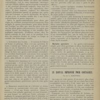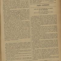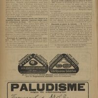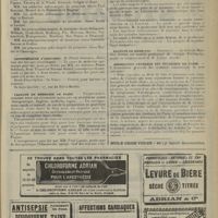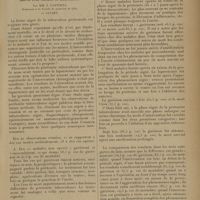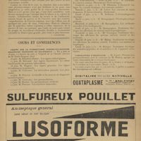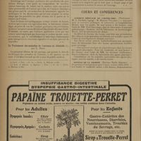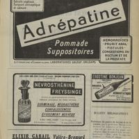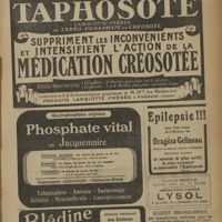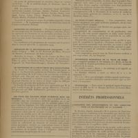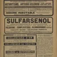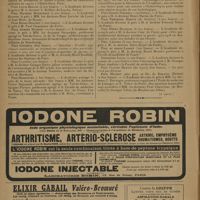 0116 - Page 108 - Intérêts professionnels. La loi tendant à combattre la dépopulation par la répression des avortements criminels et le secret professionnel. [G. Thibierge] / Sociétés savantes. Académie de médecine. (Séance du 4 février 1919). Service sanitaire de la marine marchande. M. Kfrmorgant / Les séquelles de l'intoxication par les gaz de combat. M. Achard / De l'utilité d'apprendre aux enfants à se servir également des deux mains. M. Armengaud / Un cas de ver de Guinée radicalement guéri par le novarsenobenzol en injections intraveineuses. M. Jeanselme / L'asile Médan. M. Thierry / Société médicale des hôpitaux. (Séance du 25 janvier 1919) / Cirrhose du foie avec ascite. Péritonite syphilitique. Guérison. MM. Courtois-Suffit et René Giroux / Obstruction incomplète de l'artère sous-clavière gauche observée dans des conditions exceptionnelles. Origine congénitale probable ; association à une persistance du canal artériel vraisemblable. MM. Laubry et Esmein