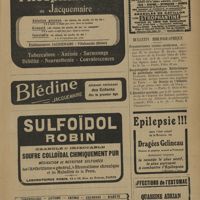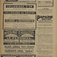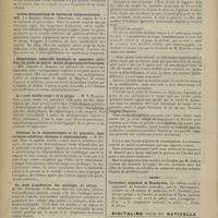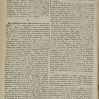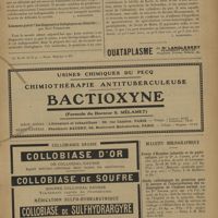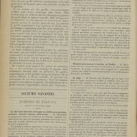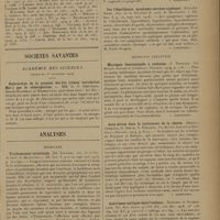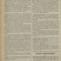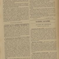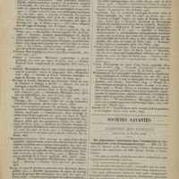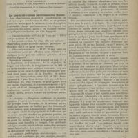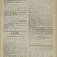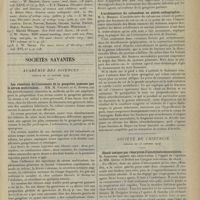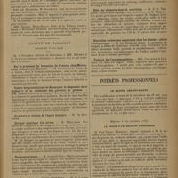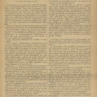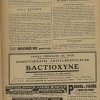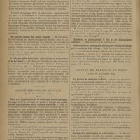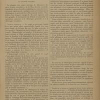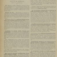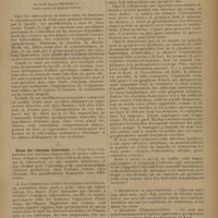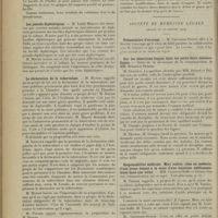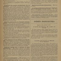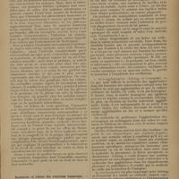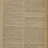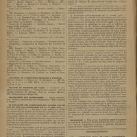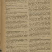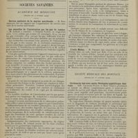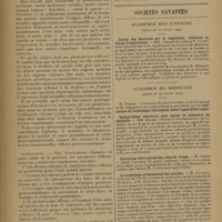 0036 - Page 28 - Sociétés savantes. Société médicale des hôpitaux. (Séance du 17 janvier 1919) / Société de biologie. (Séance du 11 janvier 1919) / Evolution des côtes. M. Retterer / MM. Masson et Regaud : Bacilles qui habitent normalement le tissu lymphoïde intestinal du lapin adulte / Cannibalisme de certaines femelles d'insectes après l'accouplement. M. Portier / Mode d'action du spirochète icterohemorragiae, suivant l'espèce zoologique envisagée. M. Corales / Sur les actions biologiques lentes des rayons X qui sillonnent en tous sens les laboratoires de radiologie. M. Guilleminot / Sur les phénomènes biologiques mis en évidence par les greffes fonctionnelles d'artères mortes. MM. Nageotte et J. Sencert / Les greffes mortes de tissus conjonctifs dans la technique chirurgicale et dans l'investigation biologique. M. J. Nageotte / M. R. Dubuis : Injections intramusculaires de saccharate de chaux / Bactériothérapie spécifique par des autovaccins dans les affections urinaires à colibacilles et à staphylocoques. MM. Hollande, Cate, Verrière / Le pneumobacille réversible et le bacille lactique aérogène. M. Marbais / Avis