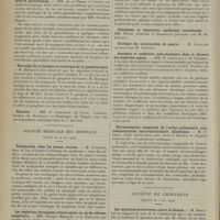 1177 - Page 1185 - Sociétés savantes. Société médicale des hôpitaux. (Séance du 21 novembre 1919). Signes physiques de radiographie dans l'adénopathie trachéo-bronchique contrôlés par la nécropsie. M. Armand-Delille / Fréquence des complications broncho-pulmonaires chez l'enfant en 1919, et leur rapport avec la grippe. M. Armand-Delille / La valeur séméiologique du myoedème. M. P. Sainton / Cas d'agénésie du tissu élastique. M. Variot / Société de chirurgie. (Séance du 26 novembre 1919). A propos des pancréatites hémorragiques. M. Delbet / A propos des fractures de Dupuytren. M. Savariaud, sur quelques observations rapportées par M. Proust / L'extraction secondaire des projectiles du foie. M. Auvray, sur cinq observations de M. Sauvé / Extraction d'un corps étranger du genou dans le ligament croisé antérieur. M. Duval, sur une observation de M. Basset / Contribution à l'étude du shock ; quatre observations de ligature des vaisseaux fémoraux communs. M. Quénu, sur quatre observations envoyées par M. Martin... / Société de biologie. (Séance du 23 novembre 1919). Action successive des deux genres d'émulsine sur l'amygdaline. M. Giata / Mucus gastrique et réaction du Biuret. M. Pron / De l'état d'anaphylaxie à l'état d'immunité. M. Arthus