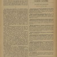 1209 - Page 1217 - Sociétés savantes. Société de chirurgie. (Séance du 3 décembre 1919). A propos des tumeurs de la langue. M. Tuffier, présenté par M. Delbet / A propos de la ligature des vaisseaux fémoraux. M. Auvray, rapport de M. Quénu / Survie de quatre ans après section de la moelle épinière. M. Lecène, sur une observation de M. Okinczyc / L'hémigastrectomie dans l'estomac biloculaire. M. Duval, travail de M. Goullioud / Quelques causes d'insuccès opératoires dans le traitement des pleurésies purulentes. M. Tuffier / Société de biologie. (Séance du 29 novembre 1919). Origine de la cellule à poussières des alvéoles pulmonaires. M. Guieysse-Pélissier / Nouvelles conception des phénomènes de la vie. M. Regnault / Immunité et anaphylaxie. M. Arthus / Tétanos expérimental du cheval. MM. Basset, Monvoisin, Pincemin / Fièvre typhoïde du cheval et anémie infectieuse. M. Basset / Dosage du glucose en présence du lactose. M. Hild / Production expérimentale de mouches à corne. M. Mercier / Hyperglycémie dans les pancréatites. MM. Achard, Ribot et Binet