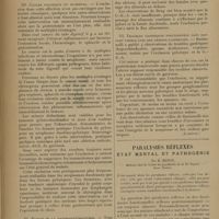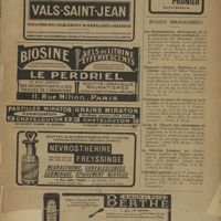 1227 - Page 1235 - Sociétés savantes. Académie de médecine. (Séance du 9 décembre 1919). Un traitement spécifique de l'angine de Vincent. M. Capitan / M. Thibierge, sur un travail de M. Le Clerc : Agénésie thyroïdienne / Société de neurologie. (Séance du 4 décembre 1919). Myopathie atrophique myotonique. L'épreuve de la bande compressive chez les myopathiques. M. Sicard / L'épreuve de la bande compressive dans le contrôle de la réflectivité tendineuse, osseuse et musculaire. M. Sicard / Deux cas d'amyotrophie spinale et bulbo-spinale post-traumatique. MM. Jean Lhermitte et L. Cornil / Les névrites amyotrophiques latentes du vieillard. MM. Jean Lhermitte et Quesnel / Sur un cas complexe de syndrome protubérantiel. MM. Pierre Marie, Chatelain et Boutier / Paralysie ascendante aiguë consécutive à l'injection de vaccin antityphoïdique. MM. Léri et Boivin / Société de biologie. (Séance du 8 décembre 1919). Rôle de l'épithélium épendymaire dans la sécrétion du liquide cérébro-spinal. MM. Grynfeltt et Euzièbe / Ictère chez le porc. M. Mélannidi / Indoxylurie consécutive à l'injection d'indol dans le foie. MM. Gautier et Hervieux / Tension superficielle et réaction de fixation. M. Kopachewski