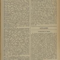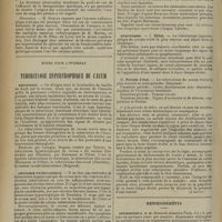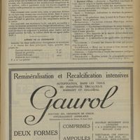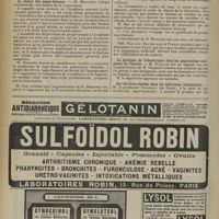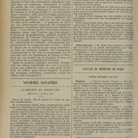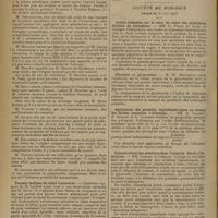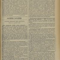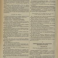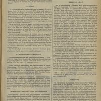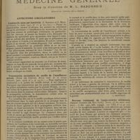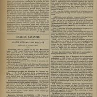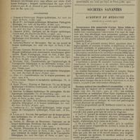 0038 - Page 28 - Sociétés savantes. Académie de médecine. (Séance du 2 janvier 1923). Ulcère simple de l'intestin grêle. M. Mériel / Société des sciences médicales & biologiques de Montpellier et du Languedoc méditerranéen. (Séance du 1er décembre 1922). Epithélioma de la parotide. Métastase dans la moelle sacrée, sans participation rachidienne et méningée. MM. Gueit et Puech / Tumeurs du testicule et radiothérapie profonde. MM. Forgue, Pares et Roux / (Séance du 8 décembre 1922). Métastase ombilicale d'un cancer du corps de l'utérus, fibro-myome de l'ovaire, épithélioma de l'ombilic. MM. Estor et Aimes / Chondrome primitif du poumon. MM. Euzière et Pages / a. Les filtrats trichloracétiques colorés ;- b. Indoxylémie et réactifs désalbuminants. MM. Portes et Cristol / Influence de la créatinine sur le dosage de l'acide urique. MM. Cristol, Nikolitch et Boukovala / Pratique médicale. Existe-t-il une tuberculine efficace et inoffensive ? Par le Docteur G. Bernard...