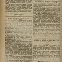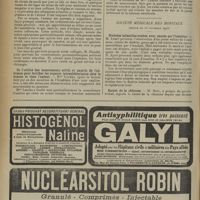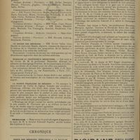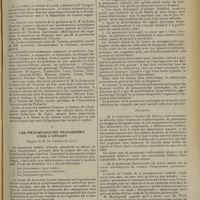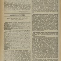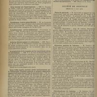 0019 - Page 9 - Sociétés savantes. Société médicale des hôpitaux. (Séance du 22 décembre 1922). Bronchite chronique et spirochètes. MM. Pagniez et Ravina / Le traitement des aortites spécifiques par le bismuth. MM. Ch. Laubry et Francis Bordet / Société de chirurgie. (Séance du 21 décembre 1922). Greffes de tendons morts. M. Mouchet, une importante communication de M. Regard... / Tumeur du sein. M. Roux-Berger / Traitement des ulcères perforés de la région pyloroduodénale. M. Duval, aux critiques que M. Lecène / Luxation récidivante de la mâchoire. MM. Gernez et Alglave / La pylorectomie chez les nouveau-nés. M. Veau / Elections / Société de pédiatrie. (Séance du 19 décembre 1922). Tuberculose chirurgicale et syphilis héréditaire tardive. A. Trèves / L'homalopsie exophtalmique, dystrophie cranienne congénitale. M. G. Blechhann